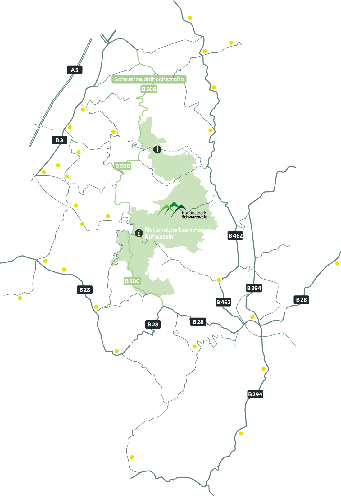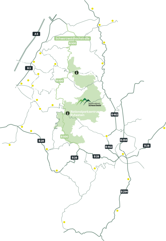 27 Gemeinden in drei Landkreisen bilden die Nationalparkregion Schwarzwald: der Landkreis Freudenstadt mit Alpirsbach, Bad Rippoldsau-Schapbach, Baiersbronn, Freudenstadt, Loßburg und Pfalzgrafenweiler; der Ortenaukreis mit Achern, Bad Peterstal-Griesbach, Durbach, Kappelrodeck, Lauf, Lautenbach, Oberkirch, Oberwolfach, Ottenhöfen, Ottersweier, Oppenau, Sasbach, Sasbachwalden und Seebach; der Landkreis Rastatt mit Bühl, Bühlertal, Forbach, Gaggenau, Gernsbach, Loffenau und Weisenbach. Gemeinsam umschließen sie die mehr als 10.000 Hektar große Fläche des Nationalparks Schwarzwald.