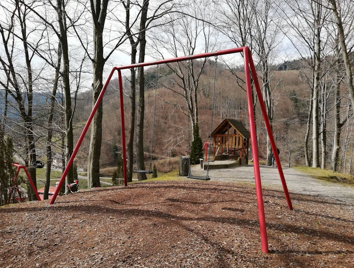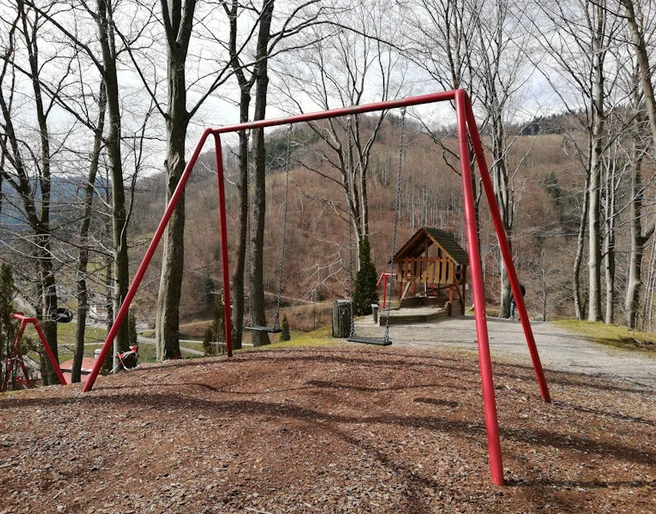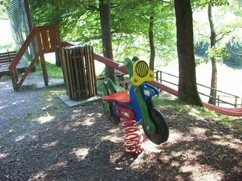 Es gibt hier eine Klettermöglichkeit, eine lange Rutsche sowie ein Wippgerät und einen großen Sandkasten. Direkt daneben befindet sich ein umzäunter Bolzplatz.