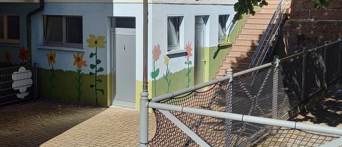 Ein Hinweisschild am Gebäude zeigt die Sanitäranlage an. Der Zugang befindet sich seitlich am Kindergarten.