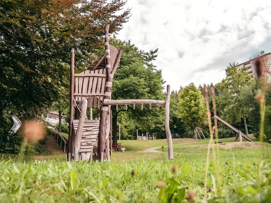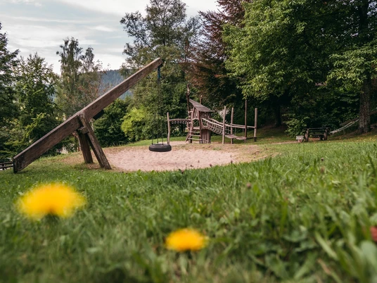 Er verfügt über zahlreiche Spielgeräte wie Rutsche, Klettergerüst, Reifen-, Standard- und Nestschaukel.