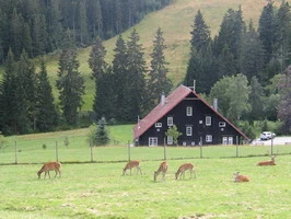 Herrlich gelegen - hinter dem ehemaligen großherzoglichen Jagdhaus von 1869, das heute das Infozentrum Kaltenbronn beherbergt, befindet sich seit 1958 ein großes Schaugehege mit heimischem Rotwild.
