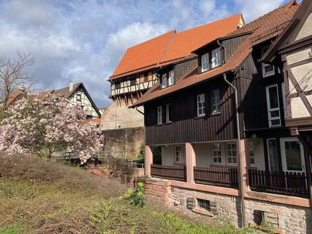 Die Zehntscheuer ist auf die Stadtmauer aufgesetzt. Dort erheben sich zwei mächtige Zehntspeicher, die zwar 1764 und 1784 neu erbaut wurden, aber auf das 16. Jahrhundert zurück gehen. Ihre Verwendung gab ihnen den Namen: zur Abgabe und Lagerung des großen Zehnten (Feldfrüchte) für die Herrschaft.
