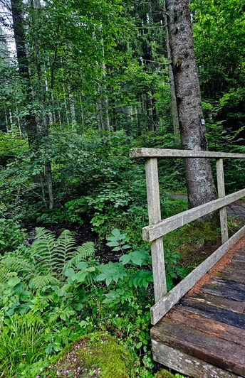 Am Wegweiser Alpenblick folgen wir dem Hirsch und gleichzeitig der gelben Raute geradeaus in Richtung Vordersteinwald. Nach etwa 1 km kommen wir zu einem idyllischen Teich mit einem Rastplatz.