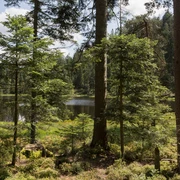 Die vierte Etappe beginnt mit einem Aufstieg auf die Hornisgrinde. 1164 m ist die höchste Erhebung des Nordschwarzwalds und bietet einen fantastischen Rundumblick auf Rheinebene, Vorgebirge und das Langenbachtal. Bei schönem Wetter ist der Aussichtsturm geöffnet. Ein interessanter Lehrpfad führt auf Bohlen über das 5000 Jahre alte Hochmoor. Besonders im Herbst zeigt sich hier ein wunderschönes Farbenspiel. Wenig später taucht im Wald der Dreifürstenstein auf. Eine mächtige Buntsandsteinplatte diente als wichtiger Grenzstein – noch heute liegt hier der höchste Punkt Württembergs und die Grenze zu Baden. Auf Naturpfaden geht es anschließend durch Bannwaldgebiet und eine Kernzone des Nationalparks, der bald darauf verlassen wird. Im weiteren Verlauf wird Murgschifferschaftswald durchwandert, davon 3 km als herrlicher Höhenpfad, auf dem Kamm zwischen Philipenkopf und Diebaukopf. Auf breitem Weg geht es entspannt weiter bis zum Schurmseeblick. Unterwegs liegt, versteckt auf einer Lichtung, ein verlandeter See namens Blindsee. Mit dem Abstieg zum mystischen Schurmsee ist der sechste Karsee des Seensteigs erreicht (zum Seeufer führt ein kurzer Abstecher). Auf den letzten 4 km geht es nochmal 350 Höhenmeter abwärts, bis an der Mündung von Schönmünz und Murg, das Etappenziel Schönmünzach erreicht ist.