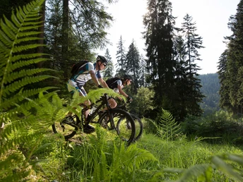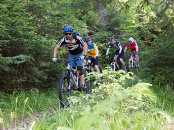 Schotterwege bringen die Radler wieder hinauf auf den Höhenrücken bei der B294. Am Hinterbuch beginnt schließlich der spaßige Teil bis zur L350. Ab hier geht's auf einem Asphaltstück hinab nach Schönegründ. Über die Alte Landstraße fährt man weiter nach Norden. Das Trailstück bergauf ist eine Herausforderung, danach können die Beine auf der Schotterauffahrt in gleichmäßigem Tritt wieder gelockert werden. Es folgt der superflowige Huzenbachtrail. Durch Huzenbach mit Versorgungsmöglichkeiten im Ortsladen radeln wir auf die westliche Talseite. Kurz unterhalb des Huzenbacher Sees taucht man in den Nationalpark Schwarzwald ein. Bei der Umrundung des Sees lohnt es sich Augen und Ohren weit zu öffnen und dieses Naturparadies auf sich wirken zu lassen. Weiter bergauf führt die Strecke zur Kleemisse. Hier unbedingt ein paar Meter weiter geradeaus fahren zum Huzenbacher Seeblick - es lohnt sich! Über einen Naturweg erreicht man das Kleemisswegle und radelt von hier aus weiter, in ständigem Bergauf und Bergab am Hang entlang. An der Johanna-Katz-Hütte (nicht bewirtschaftet) bietet sich eine Rast an mit erstklassiger Aussicht ins Untere Murgtal. Weiter geht's bis zum Hahnenstein und dann hinein in den Weiherhüttentrail, einem weiteren Leckerbissen für Spitzkehrenliebhaber. Auf dem folgenden Schotterabschnitt genießt man wieder die Aussicht und kurbelt dann hoch über den Zinkenteich bis zur Ailbachquelle. Wer schnell ankommen will, nimmt die Abkürzung. Alle anderen umrunden den Bruckenberg, legen sich auf eine der Himmelsliegen am Priorstein und entspannen sich. Die Höhenmeter sind geschafft, der Rest der Tour ist spaßig und "rollt". Eine längere Trailabfahrt mit erneut vielen Spitzkehren bringt uns hinunter ins Tonbachtal. Am Hang entlang radeln wir locker Richtung Ziel in Klosterreichenbach.