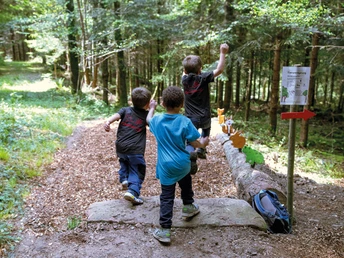 Hier gehen wir rechts weiter, einen absteigenden Forstweg entlang, zur ersten Erlebnisstation der Sprunggrube. Weiter geht’s in den Wald, an der Bienen-Kugelbahn vorbei, zur Zapfenschleuder.