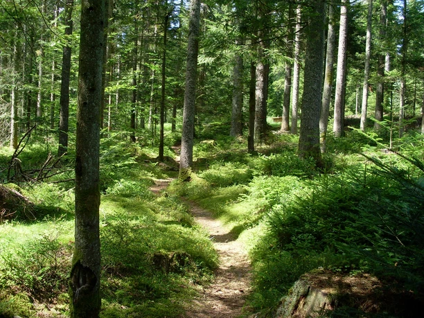 Nach kurzer Strecke sehen wir links eine Holzteuchel (ehemalige Holzwasserleitung) und den Wanderwegweiser "Hartranftweg". Hier biegen wir links ab und folgen dem schmalen Fußpfad bergauf (gelbe Raute). Einen Forstweg überquerend, wandern wir weiter auf dem Hartranftweg bis zum Wegweiser "Agnesruheweg". Hier halten wir uns links und folgen dem Forstweg bis zur Landstraße. Nachdem wir die Straße überquert haben, laufen wir über den Wanderparkplatz (alternativer Startpunkt) und folgen dem Wanderweg (gelbe Raute) Richtung Goldene Kugel Hütte und Waldliegewiese. An der nächsten Kreuzung geht es wieder links und gleich darauf rechts in den schmalen Fußpfad bis zur Waldliegewiese.