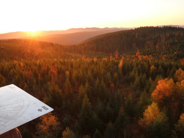 Nun wandern Sie auf dem Kandelhöhenweg rechts den Berg hinauf und bleiben Sie auf dieser Route. Bei der zweitnächsten Weggabelung gehen Sie schräg rechts den Weg hinauf Richtung Michelsbrunnen. Von hier aus folgen Sie den Wegweisern zum Moosturm hinauf. Von dort aus haben Sie einen 360° Rundblick über den Mittleren Schwarzwald bis hin in die Vogesen. Im Pavillion können Sie sich unter anderem im Gästebuch verewigen.