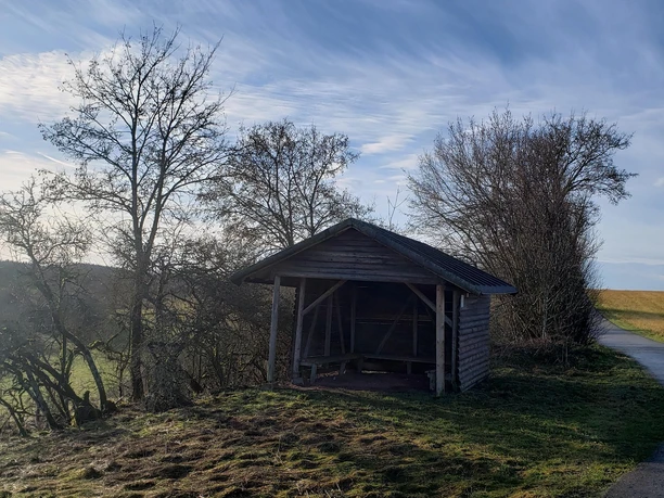 Die Straße überquerend geht es kurz nach links um dann wieder rechts, neben dem Schild welches zum Hubertussee führt auf einen geteerten Wirtschaftsweg abzubiegen. Rechts, zwischen Streuobstwiesen geht es am Bach entlang, langsam wieder den Berg hinauf, zurück zum Start der Runde. Die gelbe Raute zeigt nun wieder den Weg. Nach einem steilen Anstieg geht es nach rechts, um dann die Straße zu überqueren und auf der anderen Seite dann gemütlich die letzten hundert Meter zum Parkplatz.